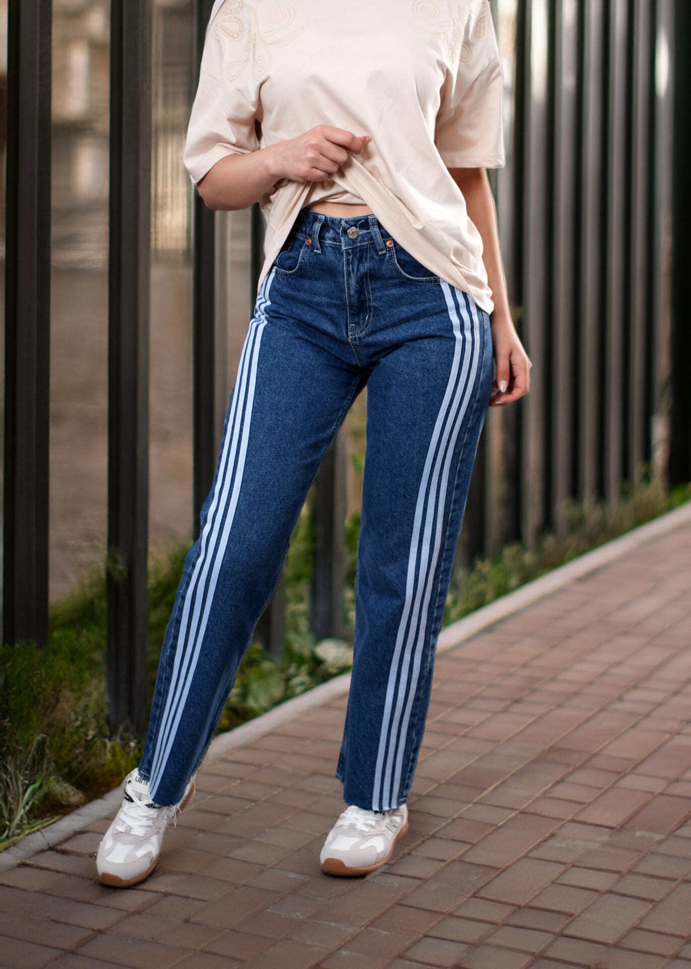 Jean bleu coupe droite au style sportif, orné de bandes latérales blanches façon « training », pour un look urbain et dynamique. Ce modèle allie le confort du denim classique à une touche athleisure moderne, parfait pour un style casual tendance.