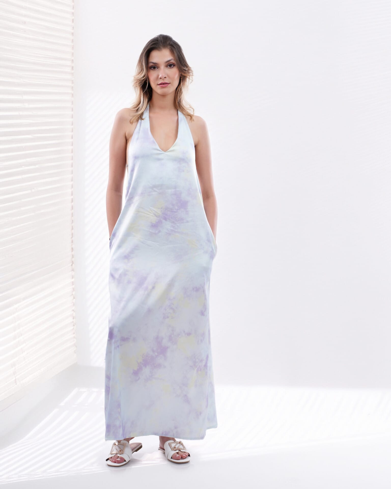 Cette robe longue au style décontracté et élégant séduit par son imprimé tie-dye pastel dans des tons doux de lilas, jaune et bleu. Son col en V et sa coupe fluide mettent en valeur la silhouette tout en offrant un confort absolu. Idéale pour les journées ensoleillées ou une escapade estivale.